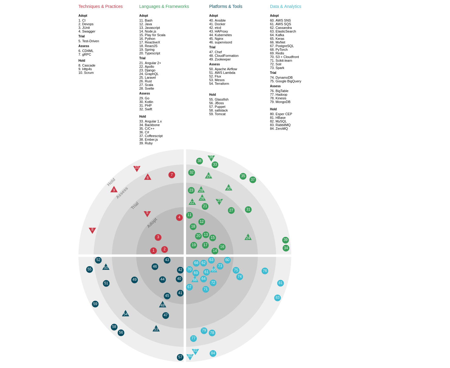 I use this tech radar to keep tabs on technologies I currently use, are under consideration, find interesting or stopped using altogether